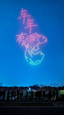 2023年2月3日,武汉市园博园。春节里文化活动丰富多彩,上演的新春无人机秀,年味儿的科技感满满,300架无人机以云梦湖夜空为幕布,以光为笔,璀璨灯光吸引众多市民观赏。