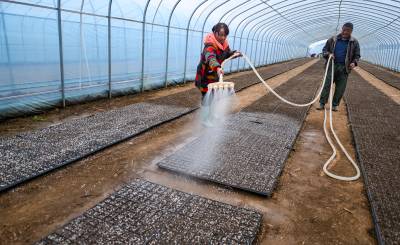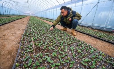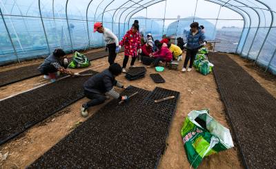 2月10日,嘉鱼潘家湾镇潘家湾村蔬菜集约化育苗基地,农民们忙碌着,装营养土、点南瓜籽,浇水、薄膜。先播南瓜种籽,已长出绿芽,生机勃勃。