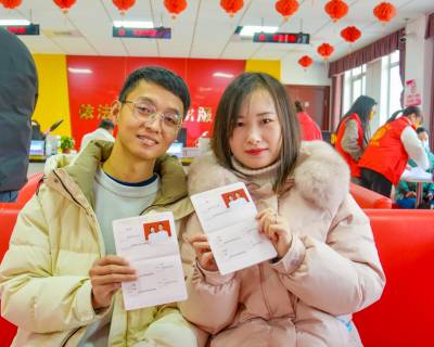 “别急别急,凭借户口本可以到一楼政务服务大厅公安窗口办理临时身份证,有了临时身份证一样可以办理结婚登记手续。”工作人员一边安慰他,一边把他引导到公安户籍窗口。10分钟时间,临时身份证办理完毕,他到婚姻登记处和准未婚妻汇合,交齐手续,快速领到了结婚证,这对新人开心地笑了。