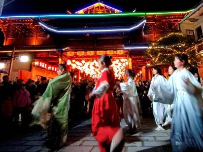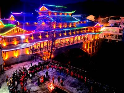 2月15日,来凤县革勒车镇文化夜热闹非凡,近千米的水系民俗风情街上,灯火通明,人头攒动。篝火摆手舞、“非遗”表演、南剧演唱、梅花仙子汉服秀竞相表演,风雨桥特色小卖及各类风味小吃更是生意火爆。