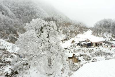 大水林场平均海拔1600米,素有“襄阳西藏、保康屋脊”之称。林场总面积1066公顷,森林面积1.54万亩,森林覆盖率96.22%,拥有保存完好的原始森林1000余亩,是襄阳市唯一保存最好的亚热带落叶阔叶林类型。每逢寒潮时,经常形成大面积的森林雾凇景观。(视界网杨韬 姜雪飞摄)