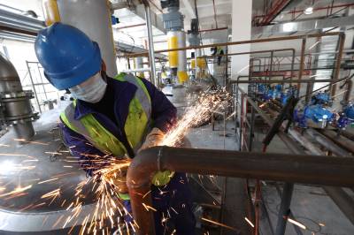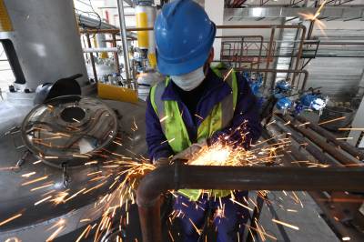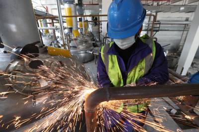 2月19日,在国内最大的胶粘剂生产制造基地湖北回天新材料股份有限公司,工人们在安装新的反应釜管道。回天公司拥有300多项专利技术发明,先后参与22项国家或行业标准的制定与修改,12款产品填补国内空白。该公司近日建成亚洲首条年产万吨级双螺杆智能化生产线,并通过集成ERP、MES、DCS、安全监控四大系统以及3000多个生产工艺控制点位精准高效监控,产品合格率高达100%。生产的环保型聚氨酯胶、改性型硅胶、高档制动液、高端封装材料、锂离子电池材料等产品,广泛应用于5G通讯、动力电池、光伏新能源、航空航天、汽车制造、包装等众多领域。