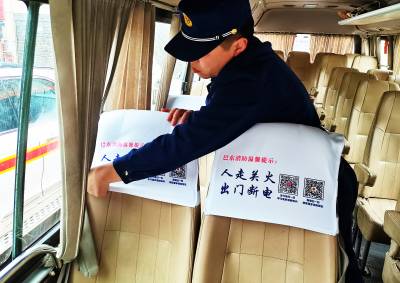 3月6日,巴东县消防救援部门将统一印制的用火用电安全提示座位套安装在乡村客运车上,时刻提醒大家注意安全。