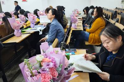 庆祝"三八"妇女节 表彰魅力女教师 男教师献花祝贺