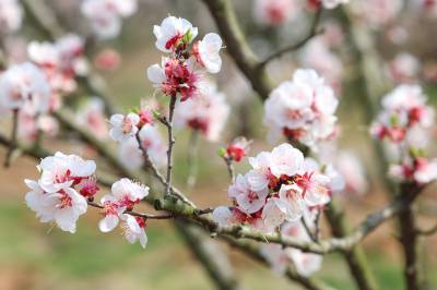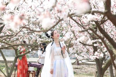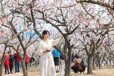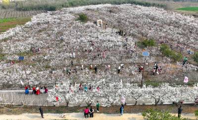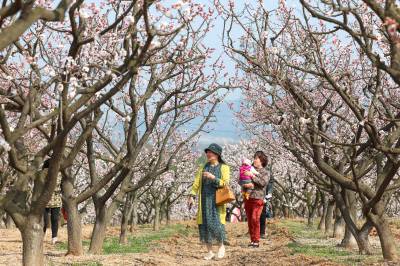 3月8日,游客在襄阳市襄城区尹集乡肖冲村杏花林中游玩。