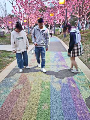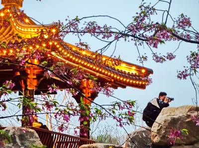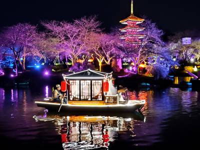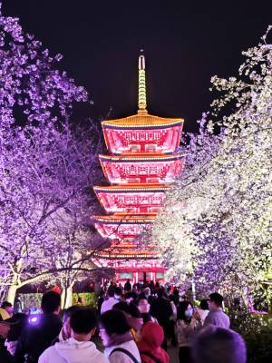 东湖樱花园夜间赏花全新升级,标志性建筑五重塔、“曲院樱艳”运用声、光、电、雾,烟花等技术手段进行活化焕新,融创意、设计、制作,呈现如梦似幻的“樱海夜倾城”。