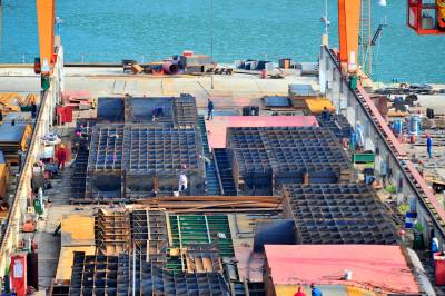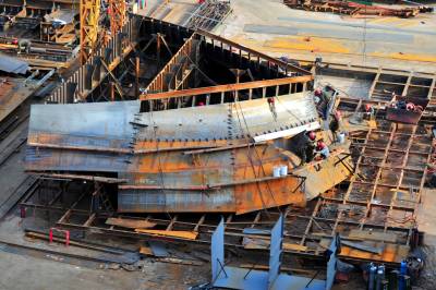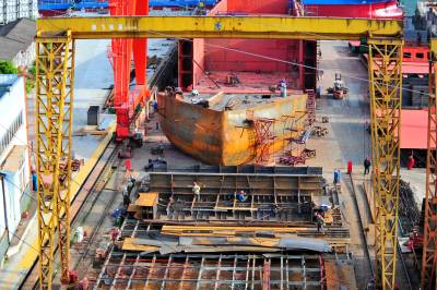 2023年4月9日,长江西陵峡岸边的宜昌市夷陵区乐天溪造船厂一片红火,工人们正在加工制造大型货船,企业开足马力赶订单,以确保尽快为客户交货。