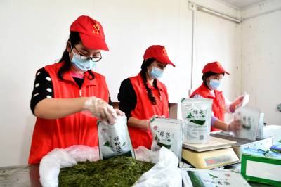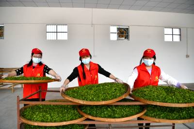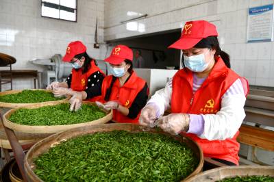 2023年4月11日,湖北省咸宁市通城县党员志愿者帮助隽水镇油坊村锦山基地茶场采摘、制作、包装春茶,供应市场,缓解劳力短缺难题。