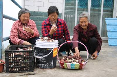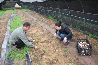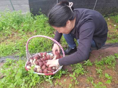 4月14日,在秭归县郭家坝镇熊家岭村双观生态种养殖专业合作社松茸试种基地大棚下,美丽的“小红帽”破土而出。寻着香味探寻,只见红松茸粗壮洁白的菌杆、褐色的菌盖直立在土堆上,胖乎乎的身躯从秸秆中羞涩地探出了红棕色的脑袋,三五个头挨着头靠在一起,憨态可掬。社员们正小心翼翼地握住菌杆,轻轻左右拧动,将其拔起并放入篮中。现在出的是第一批菇,每亩产量预计可达4000多斤。