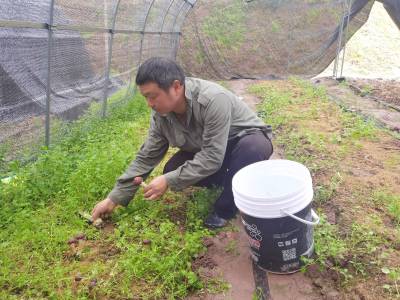 基地负责人刘献国说:红松茸适合种植在树荫下,可利用稻草、谷壳、秆壳、木屑等作为基肥,对湿度的要求较高,需要每天早晚淋一次水,湿度控制在80%以上。红松茸一般从头年10月开始种植,次年4月进入全面丰收期,至5月采收结束。