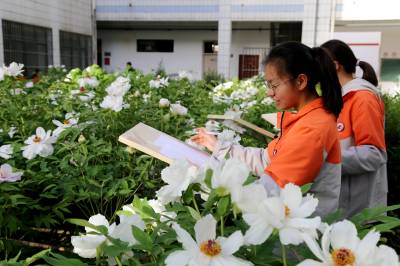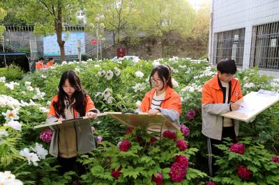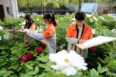 近日,保康县一中牡丹园里牡丹花竞相开放,该校组织美术社团把写生课堂搬到牡丹园,让学生们尽享春光、拥抱自然,提高艺术素养。