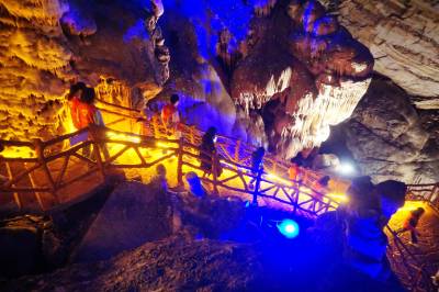 2023年4月15日,许多省内外游客在双休日慕名前来十堰市郧阳区自浪镇杨沟村占地30亩的天惊洞观赏洞内奇特的钟乳石景观。天惊洞的旅游开发与南化塘镇九龙瀑、仙女洞、白浪镇脚踏三省纪念碑、丹江北岸的河南省荆紫关镇明清老街等景区有效衔接,打造成一条边关游旅一日游线路。