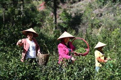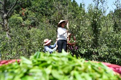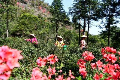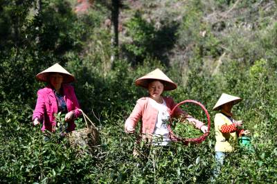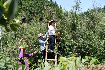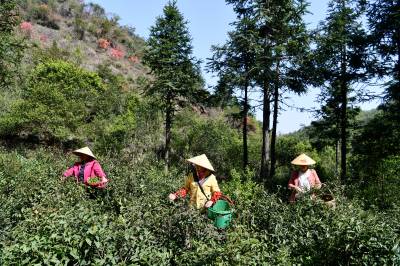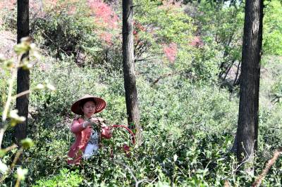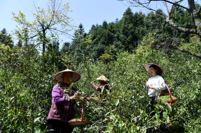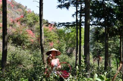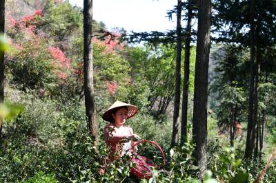 2023年4月16日,湖北省咸宁市通城县马港镇高峰村村民在大金山森林里采摘野茶鲜叶。
