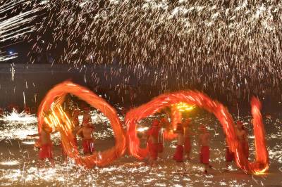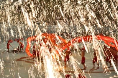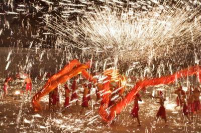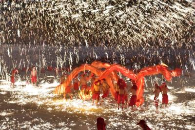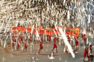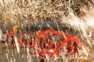 火龙舞被冠为“龙舞”之首,是龙中极品。其风味古朴粗犷,气氛激烈火爆,场面宏大喜庆。自明代以来,铜梁火龙就扎根民间,代代相传,每逢重大节庆,总是乡乡火龙舞、夜夜火龙飞。(视界网杨韬 薛渊摄)