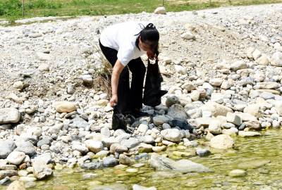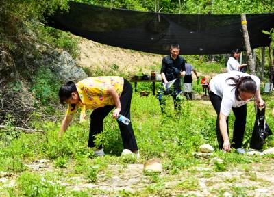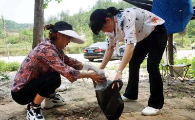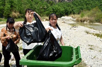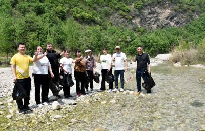 2023年4月17日,十堰市郧阳区金海湾酒店组织员工来到城关镇陈家漫村蛤蟆石景区仙人河两岸开展“捡拉圾护清水”公益活动,将捡来的拉圾装进拉圾箱。郧阳区是南水北调中线工程水源区,为保护一库清水送北京,该区社会各界深入持久的开展保护首都大水缸的清水公益活动。