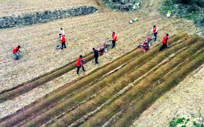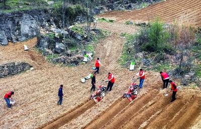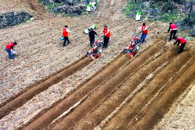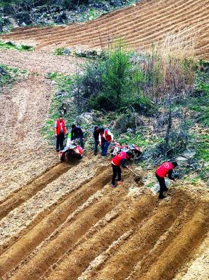 4月17日,巴东县烟草专卖局(营销部)二支部及官渡口镇烟叶收购组的部分党员、技术员在庄屋顶村帮助烟农整田、施肥、起垄垒行。