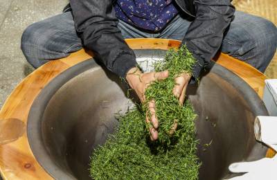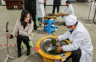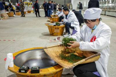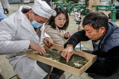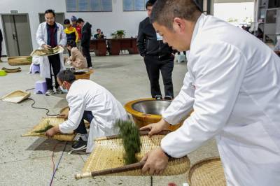 2023年4月24日,制茶能手在竹溪县汇湾镇土地梁村茶叶种植合作社参加传统制茶比赛,当地媒体进行制茶现场直播。