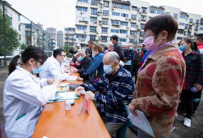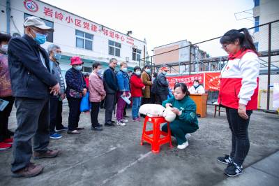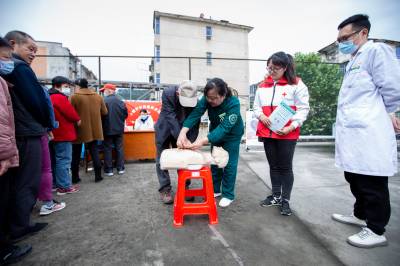 2023年5月8日,来自十堰市中西医结合医院的医务工作人员正在张湾区大岭路岩岭小区内为该小区居民开展义诊服务活动,同时为居民现场演练、普及培训了心肺复苏及海姆立克急救方法方面的应急救护知识。