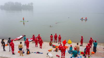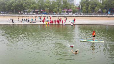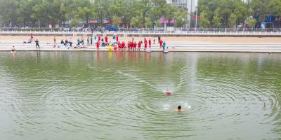 5月27日晨,嘉鱼冬泳协会红十字水上救援志愿服务队在三湖连江沙滩浴场开展防汛救灾,防溺水水上救援新装备演训活动。