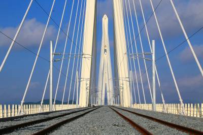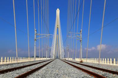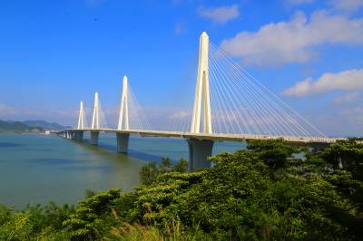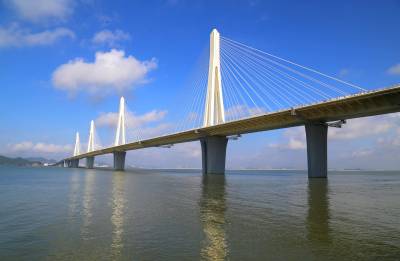 金海特大桥是珠机城际二期控制性工程,是珠三角入海口上建设的第一座公铁两用大桥,主桥为挑臂式钢箱梁多塔(4塔)公铁同层斜拉桥,桥长1369米,宽49.6米,中间通行双线时速160km/h城际铁路,同层左右两侧通行六车道时速100km/h高速公路。是世界首座公铁同层多塔斜拉桥,也是目前世界上最宽公铁两用斜拉桥。