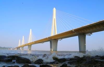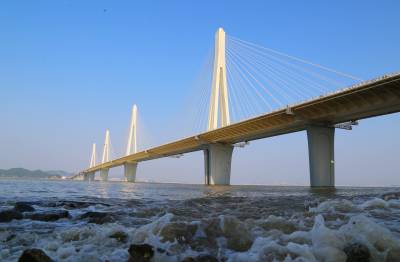 金海大桥是珠机城际二期控制性工程,是珠三角入海口上建设的第一座公铁两用大桥,主桥为挑臂式钢箱梁多塔(4塔)公铁同层斜拉桥,桥长1369米,宽49.6米,中间通行双线时速160km/h城际铁路,同层左右两侧通行六车道时速100km/h高速公路。是世界首座公铁同层多塔斜拉桥,也是目前世界上最宽公铁两用斜拉桥。