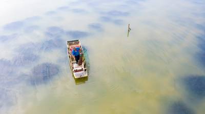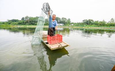 6月1日,在嘉鱼高铁岭镇陆水村1000亩稻虾共养项目基地,监利县跃进湖水产养殖专业合作社技术人员正起龙虾,清澈的湖水映蓝天白云,丰盛的水草环抱肥大龙虾仿佛在云中起龙虾。