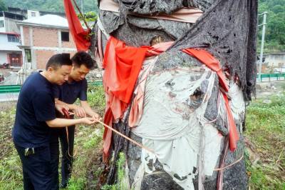 2023年6月2日,湖北省十堰市郧阳区胡家营镇林业站组织技术人员和护林员对将军河村2组移栽三年的1120年的国家一级重阳木古树进行定期监测,并对周边杂草进行清除。