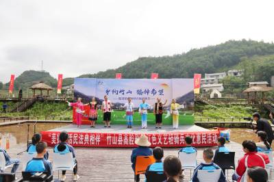 活动现场,来自县高腔剧团、文化馆红色文艺轻骑兵文艺志愿小分队表演的民歌联唱《山歌越唱越快活》在现场唱响,轻快动听的音乐,为烈日当空带来一丝清凉。随后,男声独唱《双脚踏上幸福路》、女声独唱《泉水叮咚》、《竹山高、圣水甜》,以及《插秧歌》道出了擂鼓镇人民从艰难“蜀道”走向康庄幸福大道的奋斗历程。精彩的地方文艺节目如一场独具地域特色的视听盛宴,带给观众独特的艺术享受,一次次将现场氛围推向高潮。