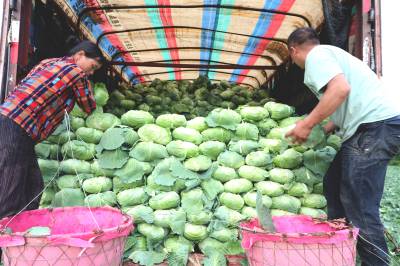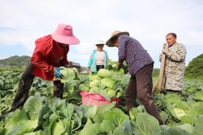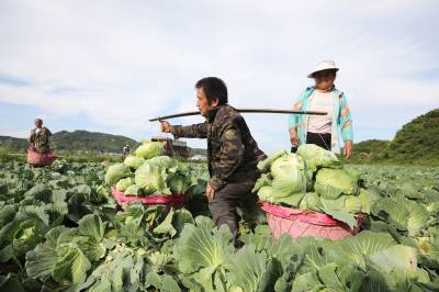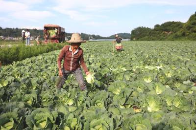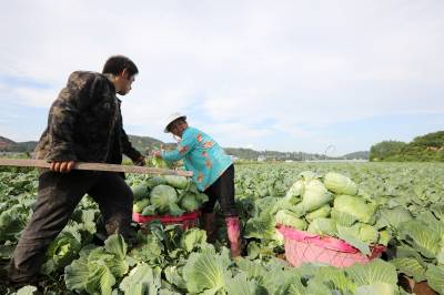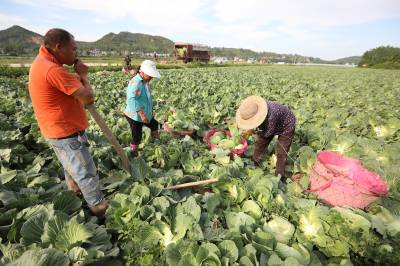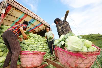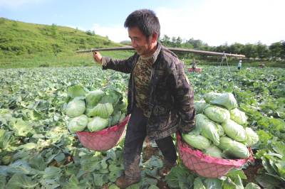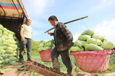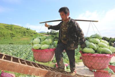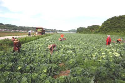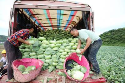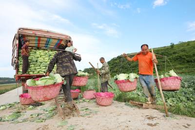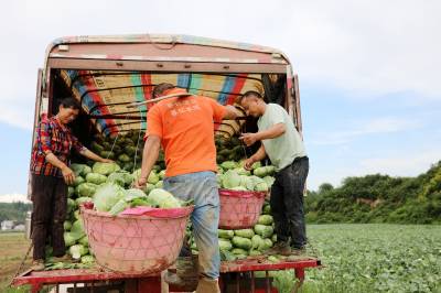 2023年6月6日,十堰市房县化龙堰镇汤峪村蔬菜丰收,当地农民正在抢抓久雨天睛时机收获装运包菜。近年来,房县充分利用独特的区位气候优势,发展规模效益型“设施园艺菜、订单露地菜、高山绿色菜、地方特色菜”,形成了集种植、观光、采摘为一体的农旅对接产业链,有效推进乡村振兴。据悉,该县干鲜菜年均实现收入达19亿元以上,其中“房县阳荷”获国家绿色食品A级认证,“房县香菇”“房县黑木耳”“房县豆油精”等干菜获得国家农产品地理标志产地认证,无公害农产品品牌达63个,带动农民增收致富。