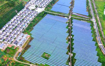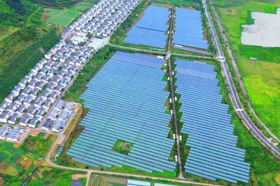 2023年6月7日,湖北省十堰市郧阳卧龙岗移民社区,鳞次栉比的别墅式民居和整齐划一的光伏产业棚,相映如画。