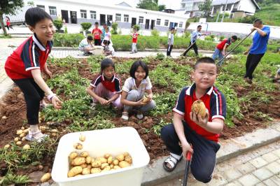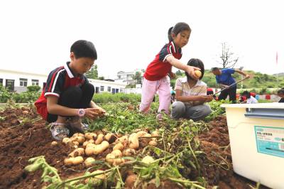 “我喜欢吃土豆,因为好吃!”“我喜欢吃土豆,因为有营养!” 6月15日,竹山县麻家渡镇营盘河小学组织师生开展劳动教育,师生扛着锄头,拿着筐子,来到土豆种植区,喜气洋洋地挖着土豆。还有的学生在老师的指导下,学习采摘辣椒、鲜桃、李子、金银花等,大家忙得热火朝天。一个个小脸上汗水涔涔,沾满了泥土的小手,挡不住种植和丰收的快乐。