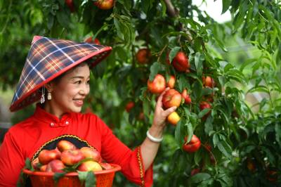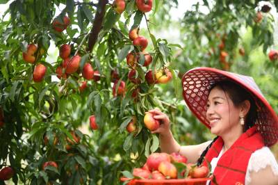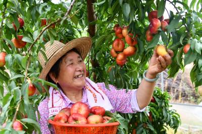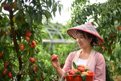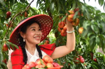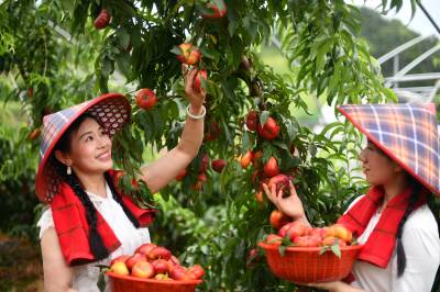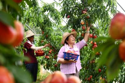 2023年6月15日,湖北省咸宁市通城县北港龙门村聚丰祥和果蔬种植合作社,社员正忙着采摘蟠桃、分拣包装,一派繁忙的丰收景象。