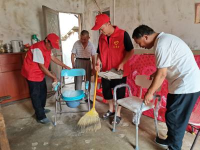 6月15日,在汉川市分水镇友好村,村支书刘才元和“共同缔造”志愿者走访慰问脱贫户孙福轩,帮他做室内和房前屋后清洁卫生。此前,民政部门为他送来了新床、方便椅和座椅,为他装修了房间。