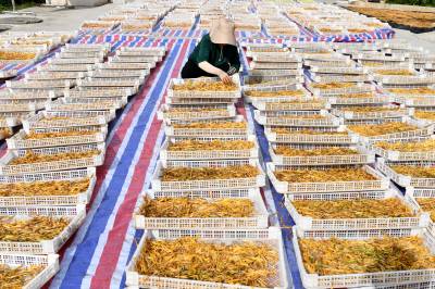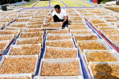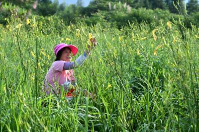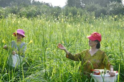 2023年6月28日,湖北省咸宁市通城县大坪乡辉煌村黄花菜基地,村民采摘,晾晒黄花菜,准备销往市场。 通城县大坪乡辉煌村不断提高土地使用率,围绕市场调整品种结构,按照“村党支部+合作社+基地+脱贫户”的产业发展思路,中药材基地套种黄花菜,以短养长,循环发展,依靠科技种养增加集体收入,以联农带农帮扶模式,合作社以务工、土地流转、生产托管模式带动脱贫户基地打工就业,壮大了集体经济,助力乡村振兴。