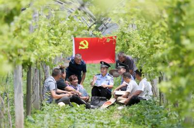 6月27日,在湖北省钟祥市磷矿镇联合村葡萄园里,一场泥土味儿十足的“主题党日”正在进行。“民警书记”宋福金与葡萄种植专业合作社的社员,就果园承包、葡萄种植及营销过程中碰到的法律问题面对面交流。