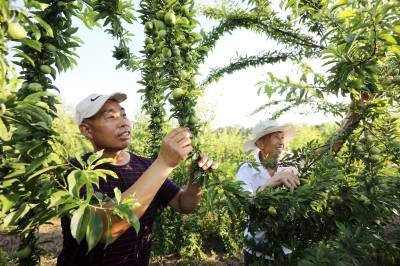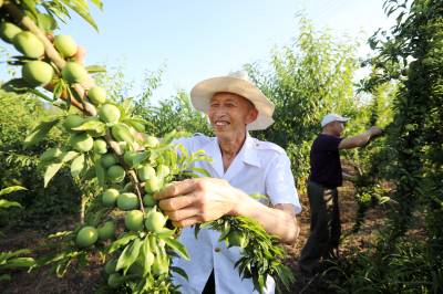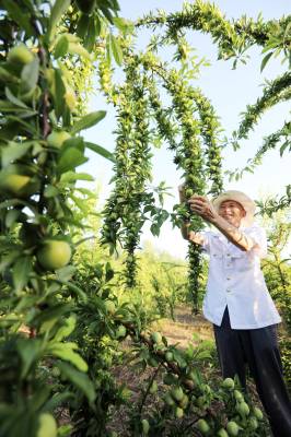 2023年7月9日,十堰市房县化龙堰镇高桥村水土治理小流域区鲜果李子压弯枝头,当地游客正在果园采摘李子。目前,房县核桃、猕猴桃、栗子、葡萄正值盛果期,血桃、黄桃、李子进入采收季,果农人均年实现收入达1万多元。近年来,该县在水土流失综合治理区发展林果60万亩,有效涵养水土,拓宽农民增收渠道,形成了乡村振兴的重要支柱产业。