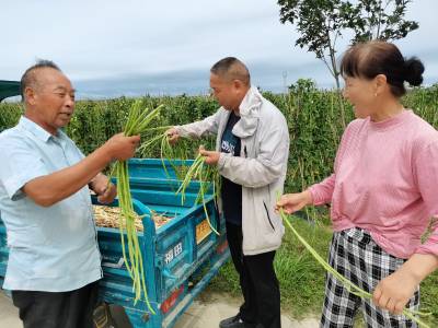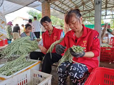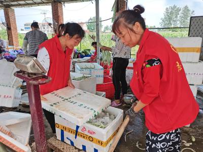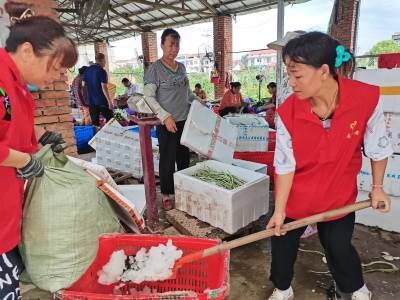 7月7日,在分水镇联合村达海专业合作社豇豆收购站,该村党支部副书记杨勇军和志愿者正协助欧阳得姣等菜农分拣豇豆,将豇豆用冰块打包上车。