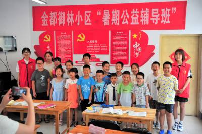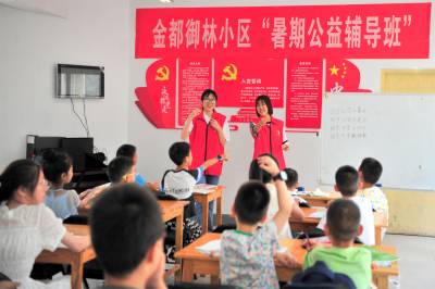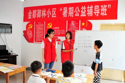 2023年7月10日,宜昌市夷陵区小溪塔街道冯家湾社区金都御林小区党支部联合业主委员会、物业公司开设的“暑期公益辅导班”免费开课。开班第一课由李皇韵菲和袁陶然两名新时代文明实践志愿者,为小区业主1至6年级孩子进行暑期作业辅导,讲解普及安全文明常识。辅导课堂上既有严肃作业书写,又有活泼的互动交流和才艺培养,让孩子们度过快乐充实的假日生活。
