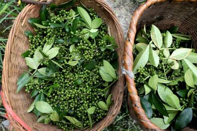 7月11日,走进竹山县楼台乡兴旺村锦鸿花椒基地,漫山遍野的花椒树枝繁叶茂,一簇簇饱满油亮的花椒挂满枝头,微风拂过,散发着浓浓椒香,村民们趁着晴好天气,正忙着剪收、晾晒、烘干花椒,待青花椒脱去水分脱粒处理后,便可上市销售。