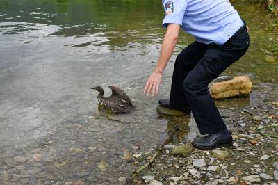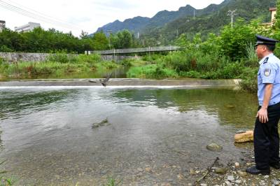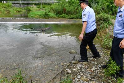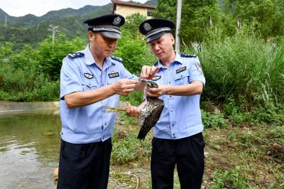 接警后,民警冒雨赶到现场,并会同林业部门对该鸟做进一步检查。经专业人员辨认,此野鸟系国家“三有”野生保护动物鸬鹚,在本县境内较为稀少。通过现场仔细检查,鸬鹚无外伤,符合放生条件。7月14日,经民警投食喂养后,将鸬鹚带至城关镇郊区进行了放生。