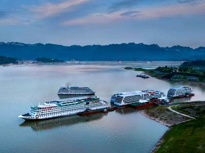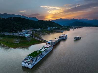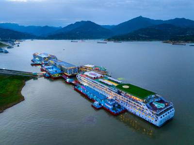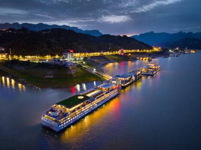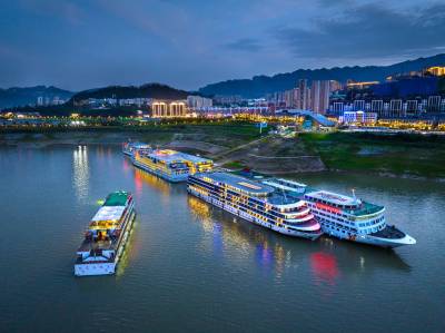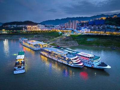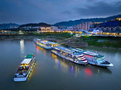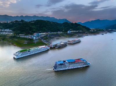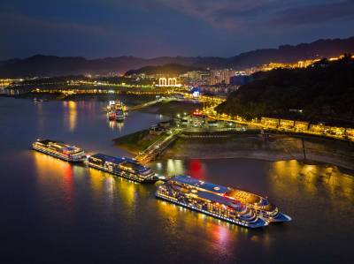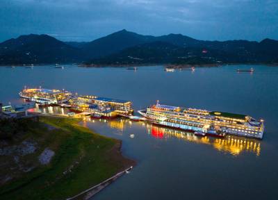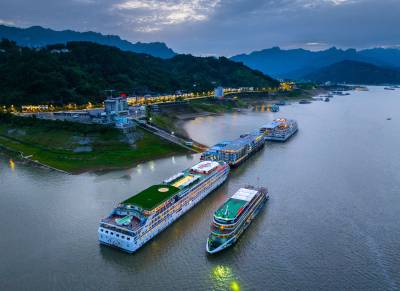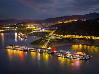 2023年7月14日傍晚,三峡库区湖北省宜昌市秭归旅游港口,码头泊位停满大型游轮,游轮有序进港出港,接送游客的车辆在港口停车场有序载客,一派繁忙景象。据重庆邮轮中心公布数据,2023年上半年长江三峡游轮共发船2260艘次,为2019年同期90%,完成客运量59.76万人,为2019年同期的122.56%。游轮平均负载率为76.40%,较2019年同期上升12.84个百分点。2023年上半年长江三峡游船市场已全面恢复2019年水平,长江三峡旅游进入新常态。