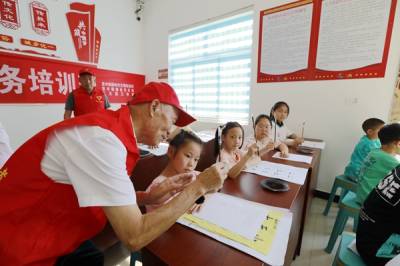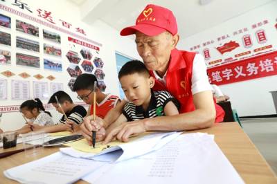 “从2019年暑期开始,我和吴勇、温大翠3人,坚持为留守孩子进行毛笔字义务培训。看到孩子们写字像模像样,我们就满足了。我们不求名不求利,趁着还能动,又有这个特长,做些力所能及的事情。希望让更多的孩子能够关注书法,学习书法,领悟传统文化蕴藏的精髓。作为我国的传统文化艺术,书法以其独特的美感一直深受人们的青睐。孩子们需要释放淘气的天性,也需要坐下来安静地接受毛笔书法带来的快乐。今后,我们会坚持把毛笔字义务培训办好、办实。” 王义富说。 (视界网 朱本双 摄)