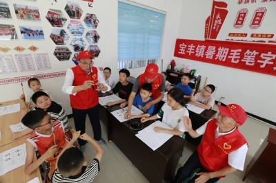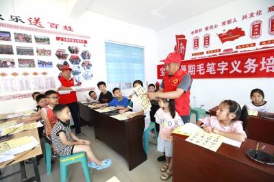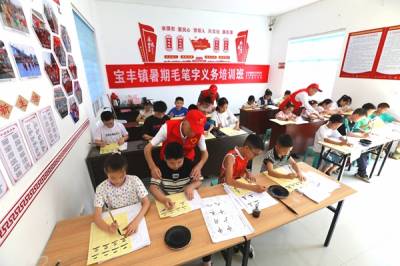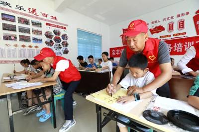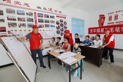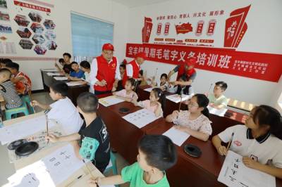 7月17日,在湖北省竹山县宝丰镇新时代文明实践中心“王义富工作室”,该工作室负责人王义富和宝丰镇退休教师吴勇、温大翠,义务为20余名留守孩子进行暑期毛笔字义务培训。老师们娴熟的拿起毛笔给孩子们做起了示范,一边示范,一边讲解,从书写工具、握笔的姿势、起笔落笔、基本笔画等方面进行了深入浅出的具体讲解。由最简单的运笔方法教起,认真详细地介绍了基本笔画的书写方法。老师们声情并茂地讲解,深深地吸引了每一个孩子,让孩子们对书法艺术有了更深刻的认识。义务培训解除家长因孩子放假无人照顾的后顾之忧,让留守孩子感受中国书法艺术的魅力,享受更充实、更快乐的暑假生活。