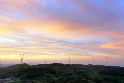 2023年7月15日,湖北省宜昌市夷陵区百里荒风电场,风电机组矗立在青山之巅,与蓝天白云、夕阳晚霞相映成景,美如画卷。