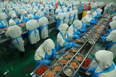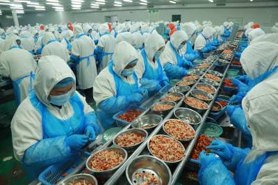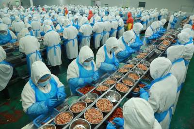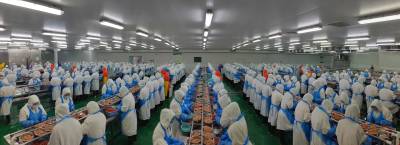 7月19日,湖北省天门市鑫天农业发展有限公司工作人员在生产线上工作。该公司是一家生产加工淡水小龙虾、速冻果蔬等产品的外向型企业,拥有全自动速冻农产品加工生产流水线10条,年加工处理速冻产品产能3万吨,装备德国先进制冷设备6套,现代化高/低温库12间,总库容18000m³,生产的“虾掌门”调味小龙虾、“和玉”花椰菜、“菜鲜优”调味毛豆与卤汁花生等一系列深加工产品深受消费者喜爱,产品通过ISO9001、HACCP、欧盟EEC、英国BRC等质管理体系认证,出口欧美数十个国家和地区,并在国内180多个大中型城市建立了销售网络。公司采取‘公司+合作社+基地+农户’模式。2012年9月获“全国农民合作社示范社”荣誉。2014年合作社申请“张港花椰菜”获得了农业部“农产品地理标志”证书。2022年公司营业收入2.03亿元,出口1000万美元。2023年公司已收购加工小龙虾7000余吨,毛豆5000余吨,生产旺季平均每天消耗原料虾100-150吨,剥出成品虾尾20-30吨,成品虾仁8-10吨,其中虾仁主要是出口北欧,每年出口800多吨,创汇1000多万美元。(视界网刘银斌摄)