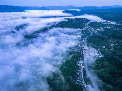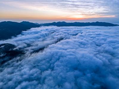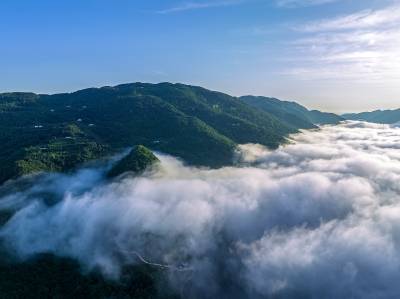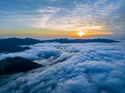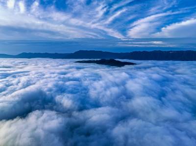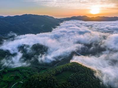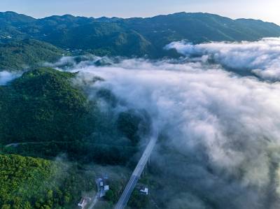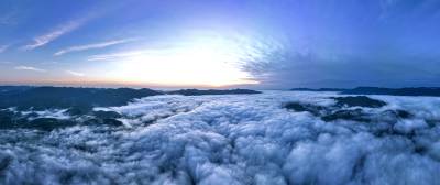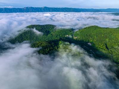 2023年7月22日,湖北省宜都市潘家湾土家族乡与王家畈镇之间渔洋河流域出现的云海景观。昨日雨后,今日凌晨时分,该区域出现大面积的云海景观,从无人机500米高度可以看到,从潘家湾境内的熊渡电站到五峰土家族自治县的渔洋关镇,其长度超过10公里,从潘家湾乡的将军山到王家畈镇的帽子尖山,其宽度也超过了5公里,气势恢宏、壮丽无比。