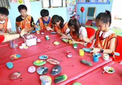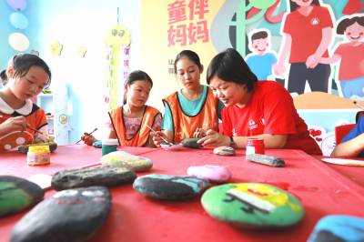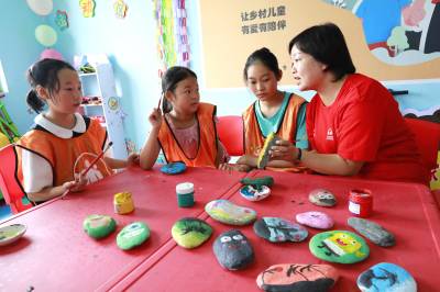 栩栩如生的小鱼、向阳而生的向日葵、宜居宜业的美丽乡村、飞速发展的卓尔•中国绿松石小镇……7月24日,在湖北省竹山县麻家渡镇营盘河村童伴之家,在童伴妈妈的指导下,孩子们把一块块小小的石头,创作成了令人称赞的石头画艺术品。