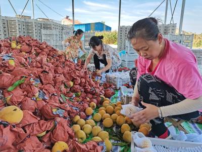 7月28日,在分水镇双丰村桃之天种植基地,驻村干部、村干部和村民们正忙着分拣黄桃,将黄桃打包上车。