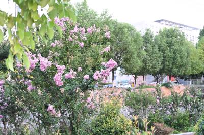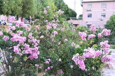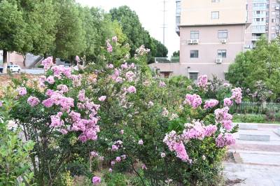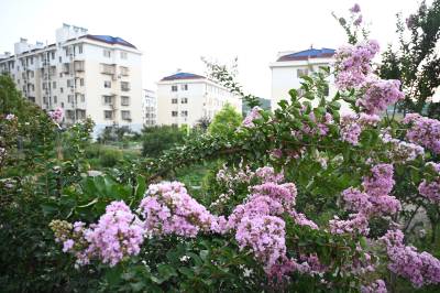 8月3日,十堰高新区郧阳区茶店镇天马大道佳恒小区盛开的紫薇花。视界网王涛摄