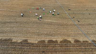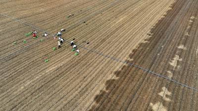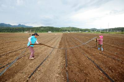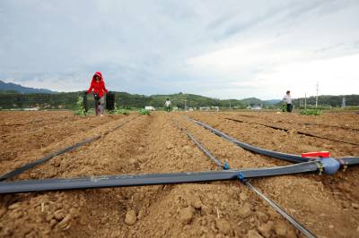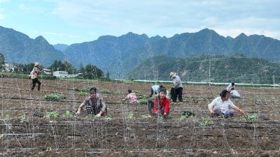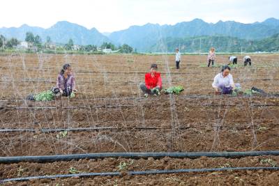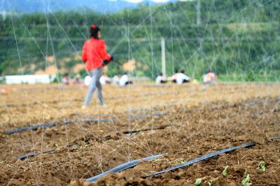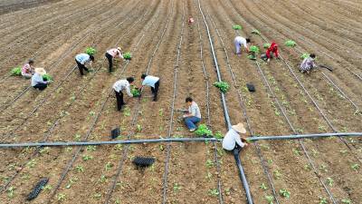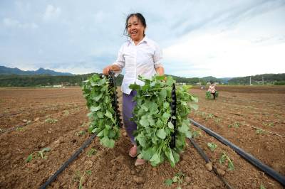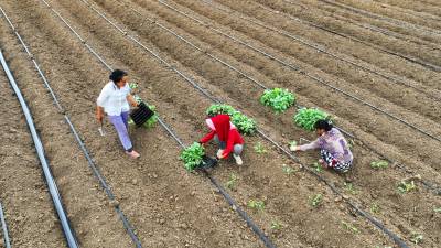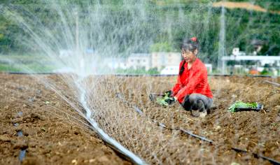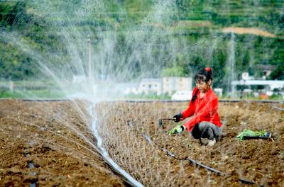 2023年8月5日,十堰市房县军店镇中村千亩高效节水灌溉示范区,当地农民在蔬菜基地移栽包菜苗,随后固定滴灌管道靶向滴水,移动式微喷管道小孔射出一束束细细的清流,滋润着青翠的菜苗。近年来,房县针对“十年九旱”的县情,全力新建、配套、升级改造中小型灌区渠道、滴灌、微喷节水设施,提高粮油、蔬菜作物抗御旱灾能力,助力乡村振兴、农业增效、农民增收。目前,该县农田节水面积达到全覆盖、滴灌与微喷灌溉蔬菜面积20余万亩,其中节水食用菌产业链超过35亿元。集约化高效节水灌溉模式,省水、省肥、省力,提高了土地产出率和经济附加值,有效增加了农民收入。